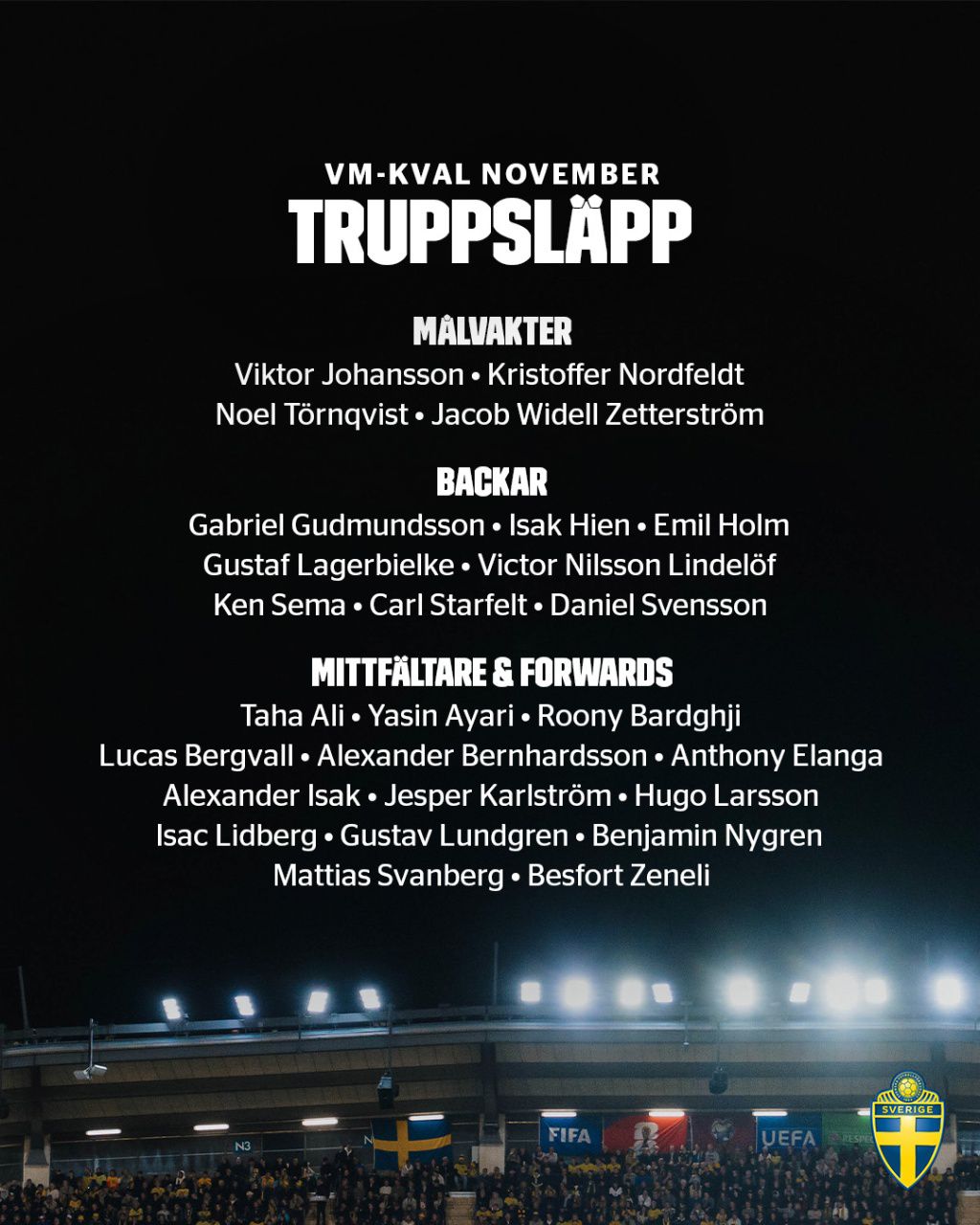 กองกลาง: เบจริวาร์ (สเปอร์ส), ยาชิน อา ยาริ (ไบรท์ตัน), ฮูโก้ ลาร์สสัน (ไอน์ทรัค แฟรงก์เฟิร์ต), สแวนเบิร์ก (โวล์ฟสบวร์ก), คาร์ลสตรอม (อูดิเนเซ่), เซเนลลี (เอฟสบวร์ก), ลุนด์เกรน (โกเธนเบิร์ก)