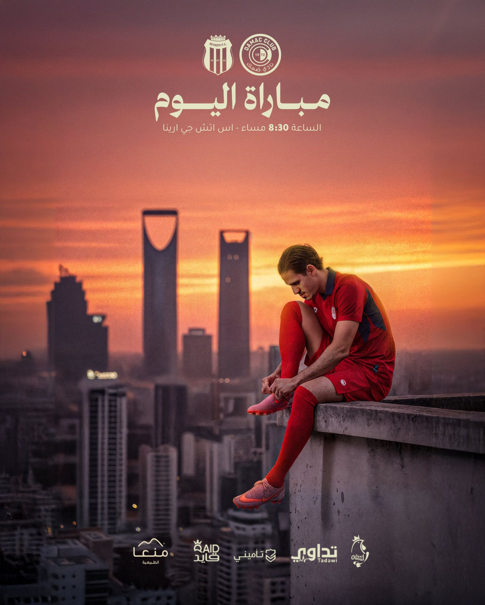 โปสเตอร์แสดงให้เห็นผู้เล่น DAMAC สวมชุดทีมนั่งอยู่บนขอบหลังคาและผูกรองเท้า