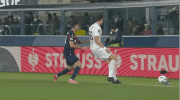 18’ เข้าประตูตัวเองที่อันตราย! โบโลญญ่าบุกจากทางขวา และแบร์นาร์เดสคี่จ่ายบอลจากเขตโทษเกือบเด้งเข้าปากประตู