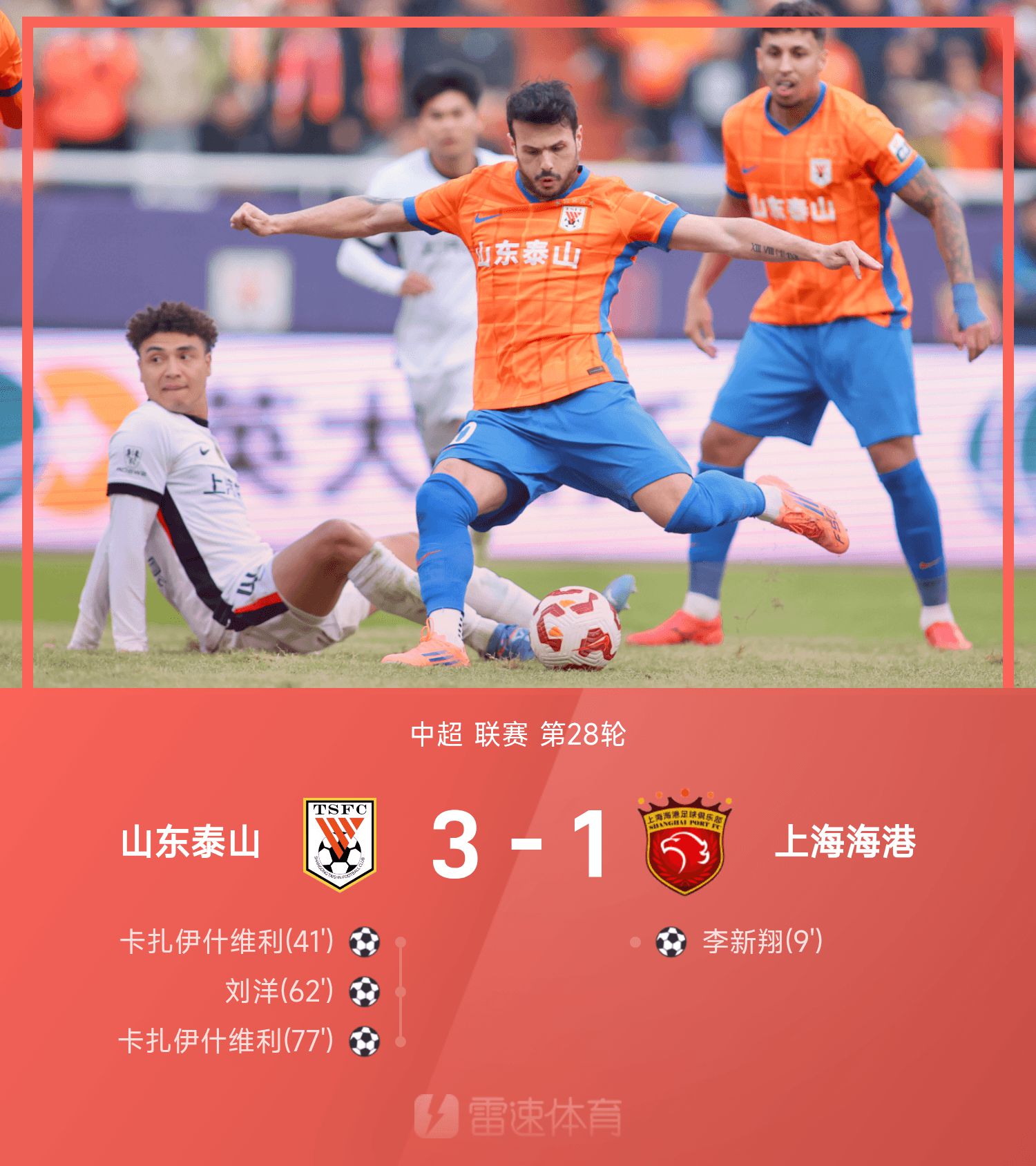 รายงานไชนีส ซูเปอร์ลีก: กาซ่าทำได้สองเท่า, เลโอนาร์โด้เลิกอาการบาดเจ็บ, ไท่ซานพลิกกลับไห่กัง 3-1