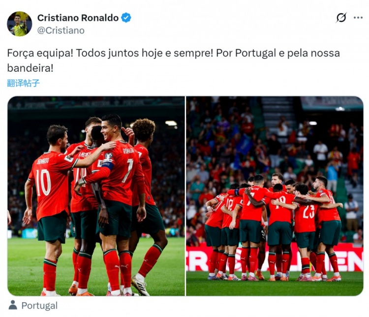 ซี โรนัลโด้เขียนว่า: "มาเลยโปรตุเกส! วันนี้และตลอดไป เราสามัคคีกัน! สู้เพื่อโปรตุเกส เพื่อธงของเรา!"