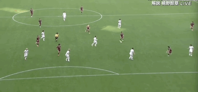 12' คิโนชิตะ โคสุเกะโหม่งบอลในโซนสามวินาที แล้วบอลหลุดออกจาก ขอบเขต