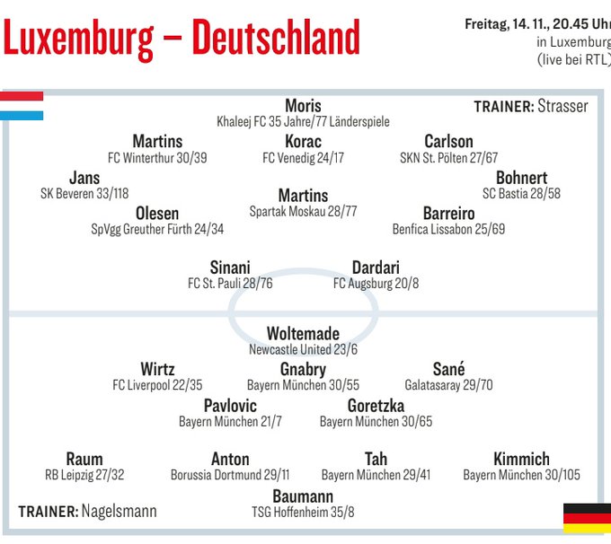 6686 Sports รายงานเมื่อวันที่ 13 พฤศจิกายนว่าในการแข่งขันรอบแบ่งกลุ่มยุโรปของการแข่งขันฟุตบอลโลกรอบคัดเลือก ทีมเยอรมันจะท้าชิงทีมลักเซมเบิร์กนอกบ้าน ก่อนเกมสื่อกีฬาเยอรมัน “คิกเกอร์” ทำนายรายชื่อตัวจริงของทีมเยอรมันสำหรับเกมนี้ หนึ่งในนั้นคือหมายเลข 5 วอลเตอร์ มาเดอร์ ผู้เล่นให้นิวคาสเซิ่ล ปรากฏในตำแหน่งลูกศรเดียว เวิร์ตซ์ที่ประสบปัญหาในลิเวอร์พูลได้รับโอกาสในการออกสตาร์ทและปรากฏตัวในตำแหน่งกองหน้าซ้าย ซาเน่ที่กลับมาติดทีมชาติได้ปรากฏตัวในตำแหน่งกองหน้าขวา