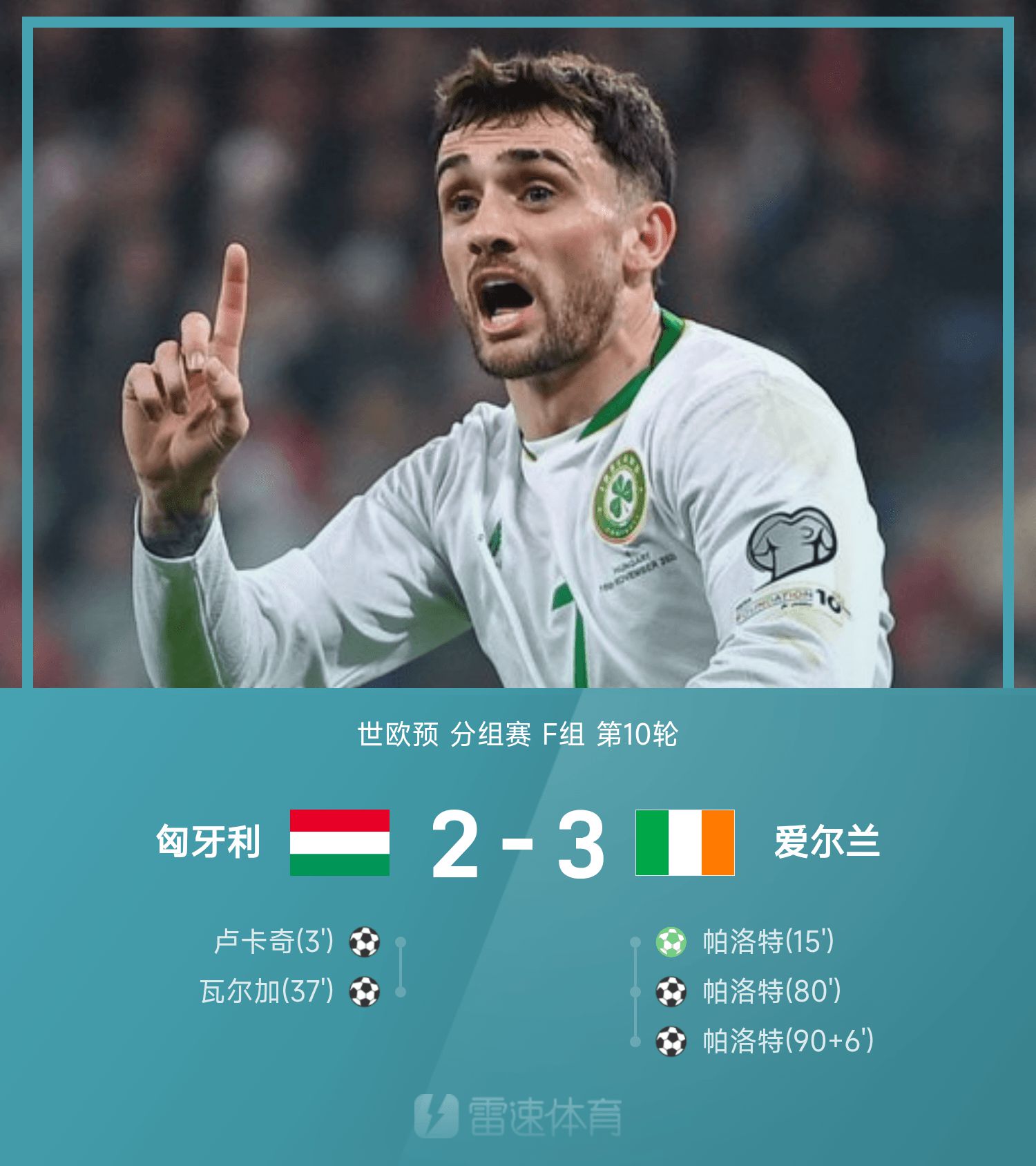 6686 ข่าวกีฬาวันที่ 17 พฤศจิกายน ในรอบที่ 10 ของกลุ่ม F ของเกมรอบคัดเลือกโลกยุโรปปี 2026 ไอร์แลนด์เอาชนะฮังการี 3-2 ไม่นานหลังจากเกมเริ่ม Lukacs ก็ยิงแบบสายฟ้าแลบ จากนั้น Parrott ก็ยิงประตู และคลื่นโลกของ Varga ก็พลิกสกอร์ของเกมอีกครั้ง ในตอนท้ายของครึ่งหลัง แพร์รอตต์ทำประตูด้วยลูกเทนนิสและยิงประตูสุดท้ายในช่วงทดเวลาบาดเจ็บ ไอร์แลนด์พลิกกลับฮังการีและผ่านเข้าสู่รอบเพลย์ออฟ