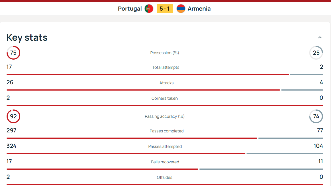 ตัดสินจากสถิติช่วงพักครึ่ง อัตราการเลี้ยงบอลของโปรตุเกสอยู่ใกล้ 80% โดยยิงไวด์ 17 ครั้ง