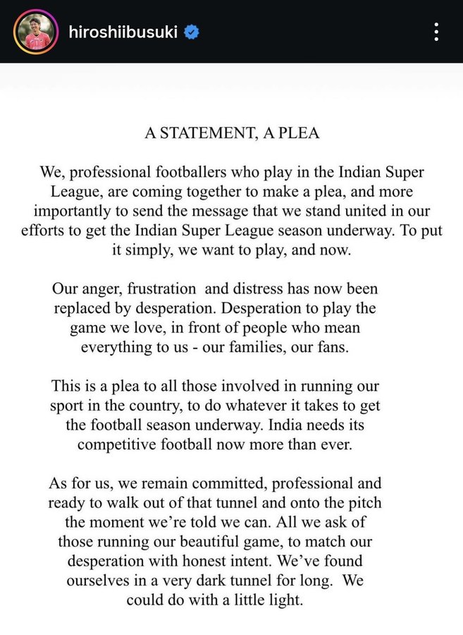 "ความโกรธ ความหงุดหงิด และความเจ็บปวดในตอนแรกได้ถูกแทนที่ด้วย ความสิ้นหวัง เรากระตือรือร้นที่จะวิ่งอีกครั้งต่อหน้าครอบครัวและแฟน ๆ ของเรา สนามสีเขียวอันเป็นที่รัก เราขอเรียกร้องให้ทุกคนที่รับผิดชอบในการจัดการฟุตบอลอินเดียพยายามทุกวิถีทางเพื่อเริ่มต้นฤดูกาลใหม่ให้เร็วที่สุด ตอนนี้อินเดียต้องการฟุตบอลอาชีพที่แท้จริงมากขึ้นกว่าเดิม” ความจริงใจ เราเดินทางอยู่ในอุโมงค์มืดอันยาวไกลและต้องการแสงสว่างอย่างสิ้นหวัง"