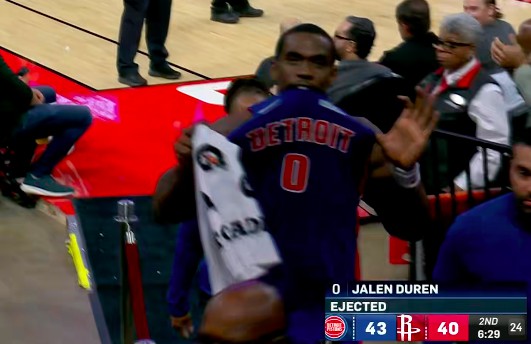 มากกว่า 6 นาทีในควอเตอร์ที่สอง อาเมนและดูเรนทะเลาะกันทีละคน เป็นครั้งแรกที่อาเมนจงใจละเมิด Duren และอย่างหลังผลักอาเมนออกไปและได้รับการละเมิดทางเทคนิค ในไม่ช้าทั้งสองก็พบกันอีกครั้ง และศอกของดูเรนก็ฟาดเข้าที่หน้าอาเมนโดยตรง ผู้ตัดสินไล่ Duren โดยตรงหลังจากเล่นซ้ำ ทำให้เขาฝ่าฝืนเจตนาร้ายระดับที่สอง