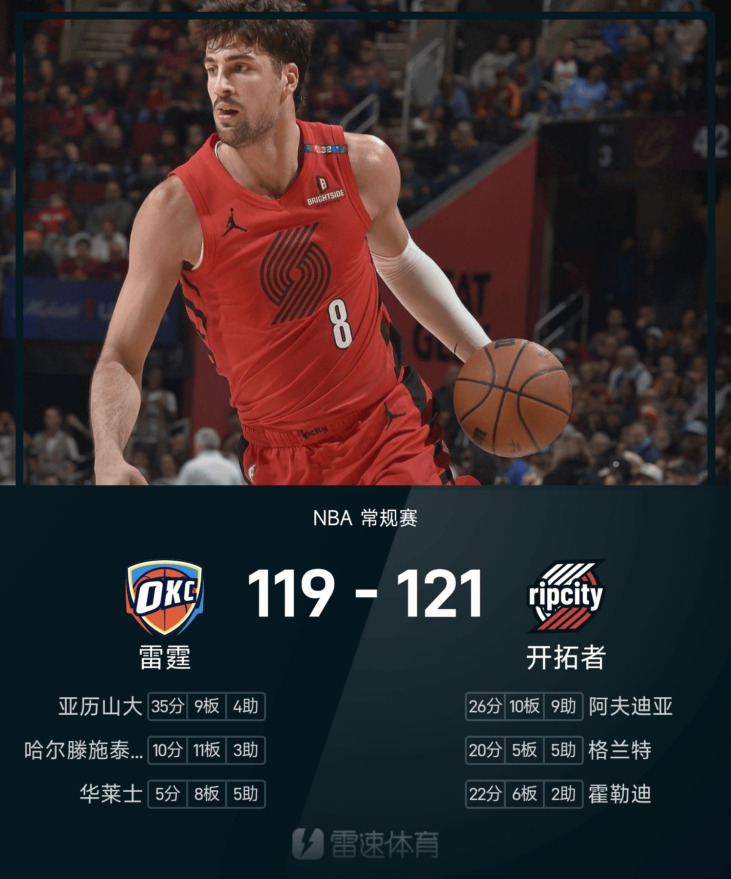 รายงานเกม NBA อาฟดิจา 26 แต้ม หยาง แฮนเซ่น ไม่ปรากฏ เทรลเบลเซอร์ส 121-119 ธันเดอร์