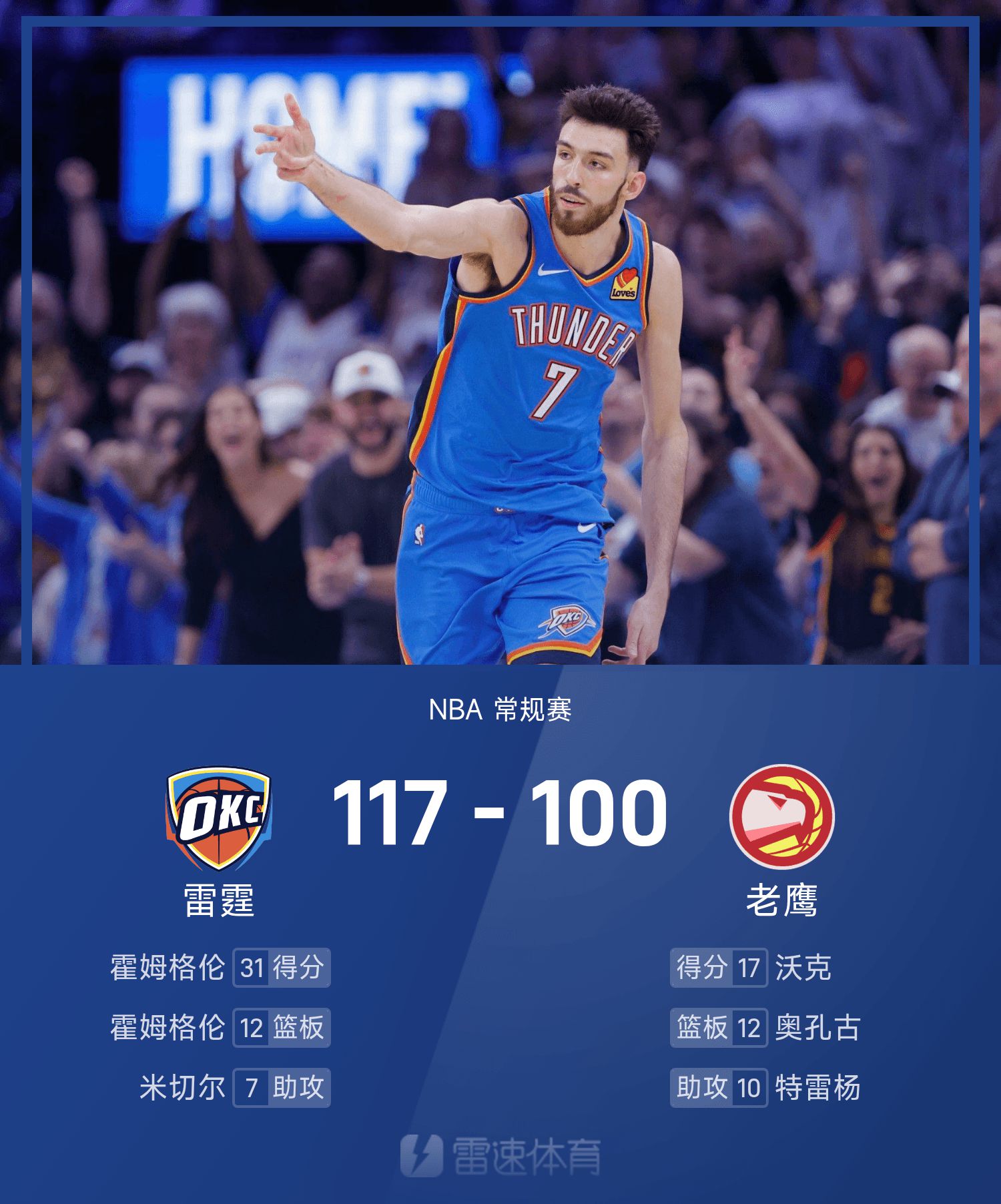 รายงาน NBA โฮล์มเกรน 31 แต้ม 12 รีบาวด์ ธันเดอร์ เอาชนะ ฮอว์กส์ 117-99