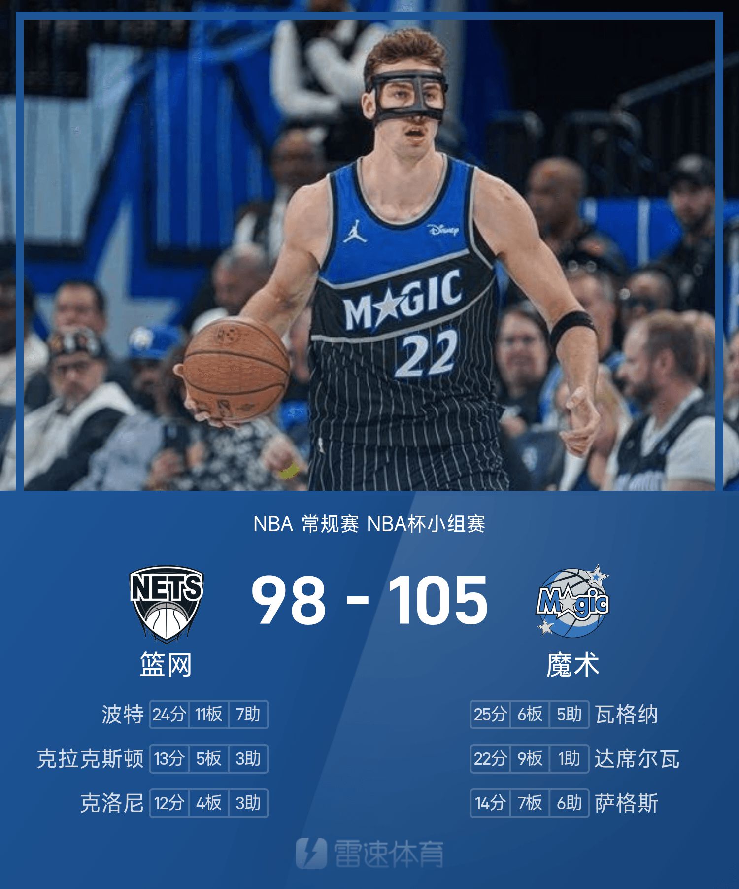 รายงาน NBA วากเนอร์ 25 แต้ม 6 รีบาวด์ เมจิก เอาชนะ เน็ตส์ 105-98