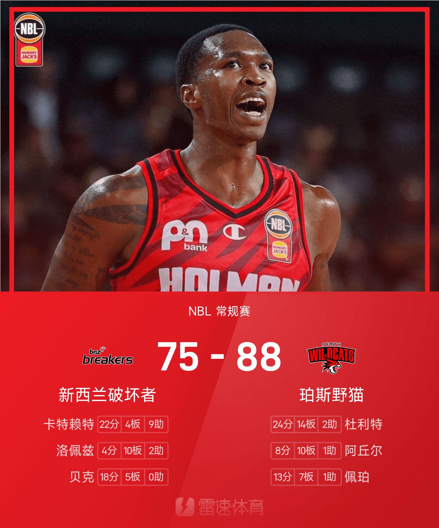 6686 กีฬา ข่าว 15 พฤศจิกายน ในฤดูกาลปกติ 25/26 NBL ทีม Perth Wildcats เผชิญหน้ากับเรือพิฆาตนิวซีแลนด์ จบเกม Perth Wildcats เอาชนะ New Zealand Destroyers 88-75 ดูลิตเติ้ลทำคะแนนสูงสุดในเกม 24 แต้ม 14 รีบาวน์และ 2 แอสซิสต์ นำทีมเพิร์ธไวลด์แคทส์คว้าชัยชนะ