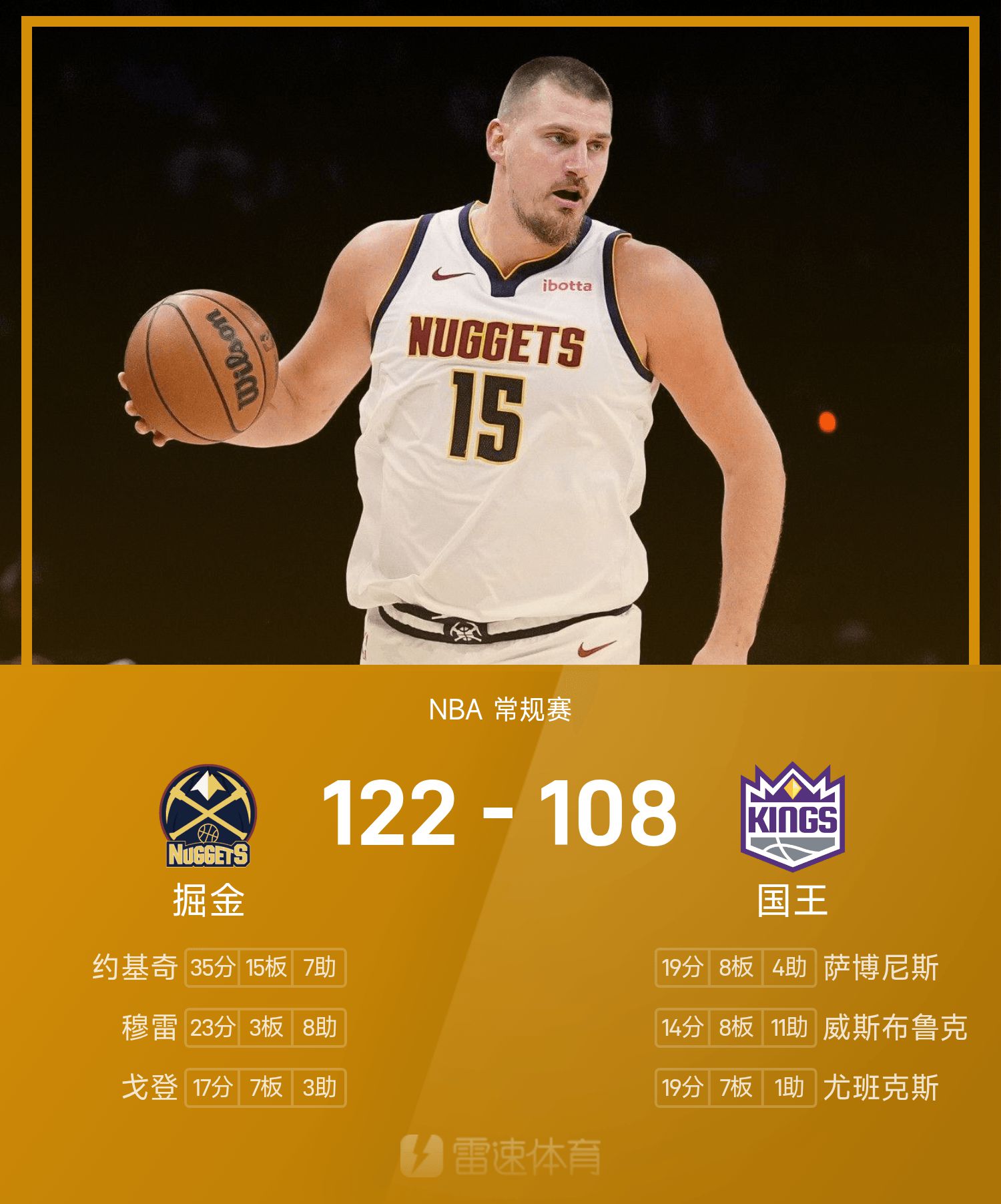 รายงานเกม NBA โยคิช 35 แต้ม 15 รีบาวด์ 7 แอสซิสต์ นักเก็ตเอาชนะคิงส์ 122-108