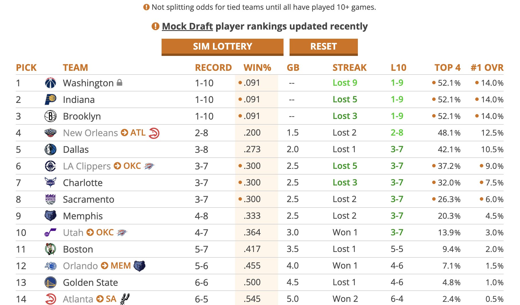 เป็นที่น่าสังเกตว่าในรายการนี้ Thunder ซึ่งปัจจุบันอยู่ในอันดับที่ 1 ในลีก จริงๆ แล้วมีการเลือกลอตเตอรีสองตัว การเลือกครั้งที่ 6 และ 10 และการเลือกรอบแรกทั้งสองนี้ได้มาจากการทำธุรกรรมเมื่อไม่กี่ปีก่อน