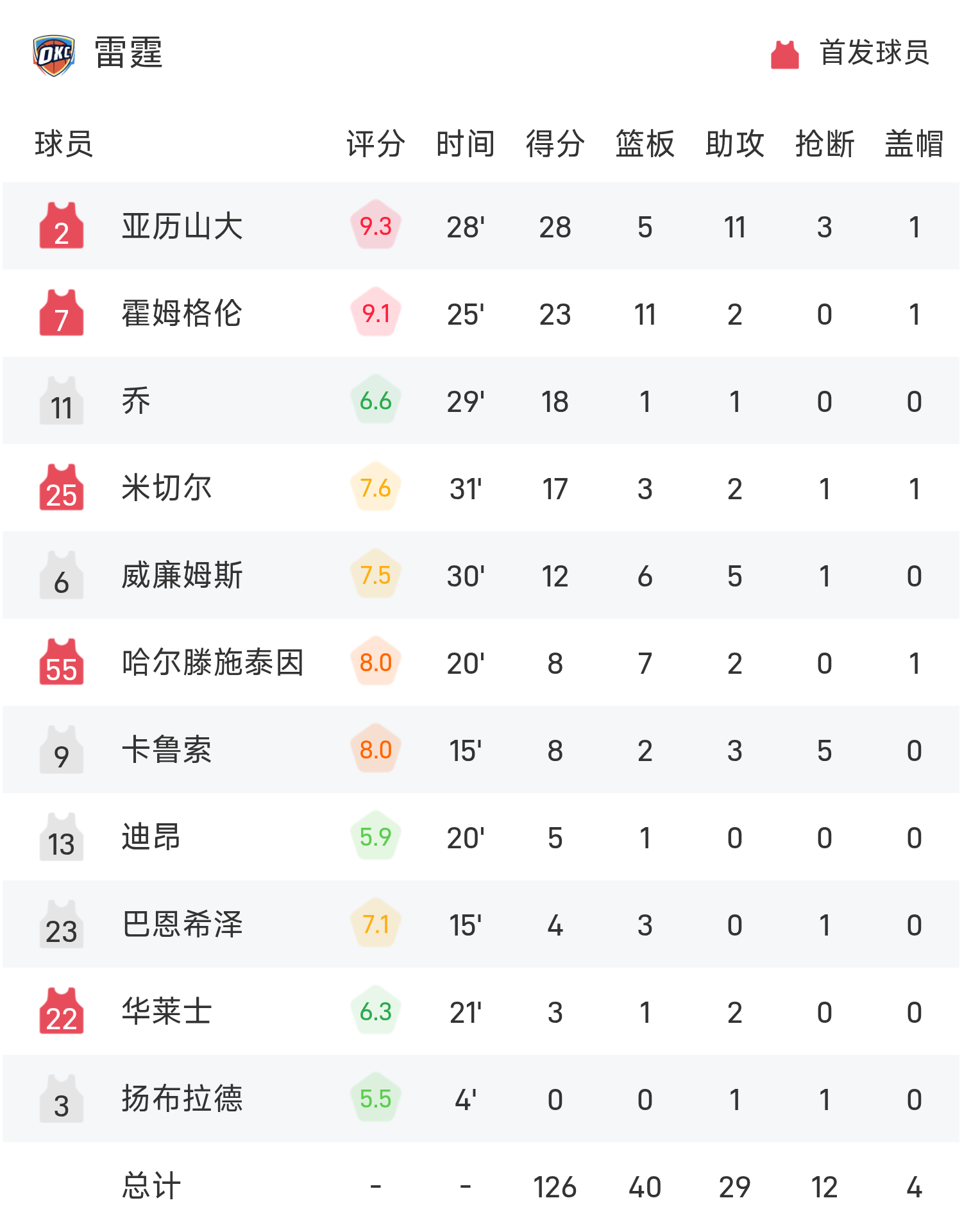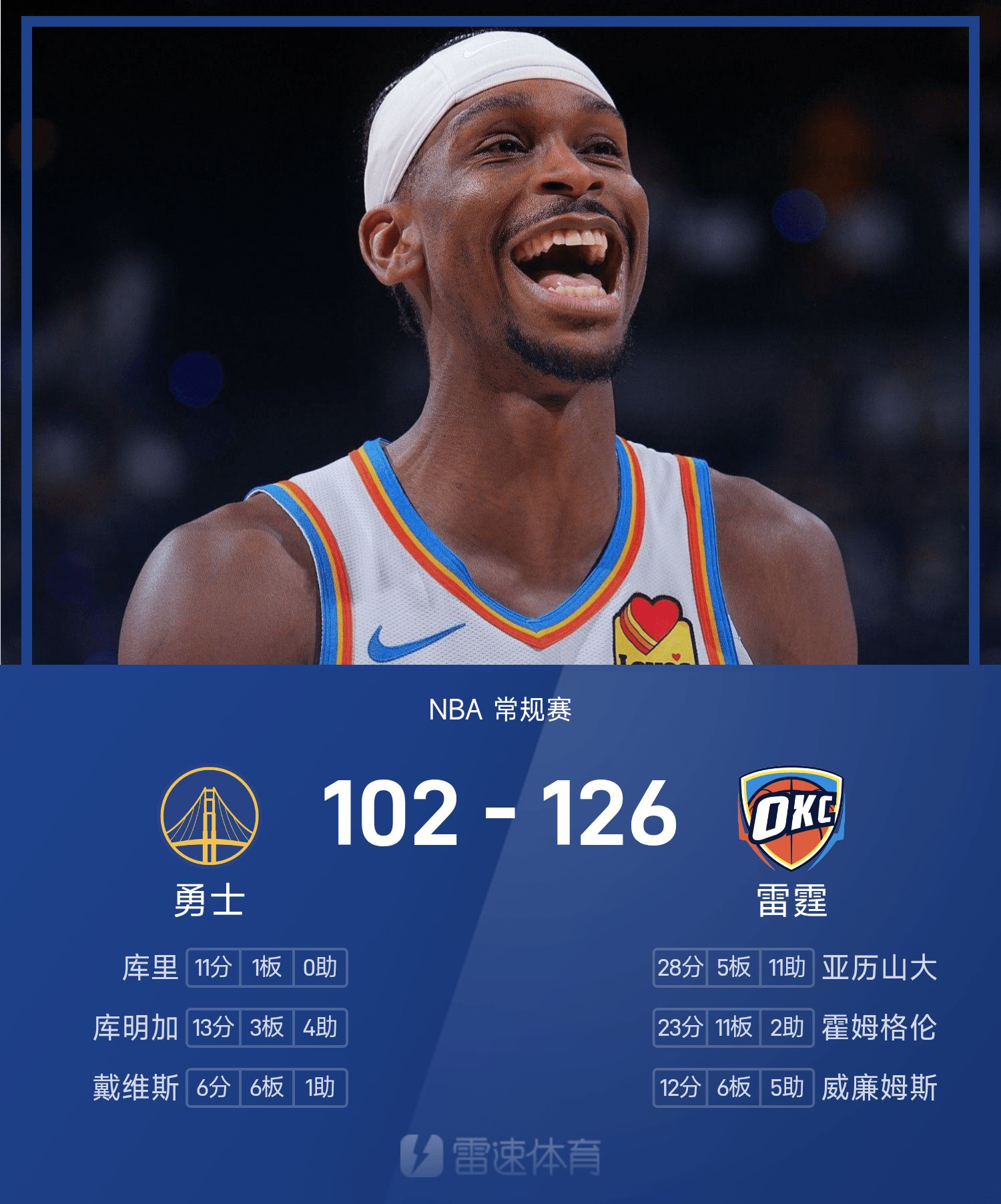 รายงาน NBA: อเล็กซานเดอร์ 28 แต้ม 11 แอสซิสต์ ธันเดอร์เอาชนะวอร์ริเออร์ส 126-102